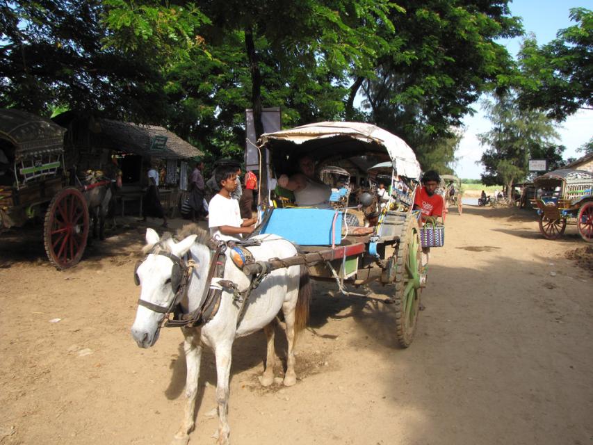Все оказалось так, как Катя уже не раз видела, никакого причала: карабкайся наверх, как хочешь. Человек 50, видимо ежедневно, встречают пароход и предлагают гостиницы на разный кошелек. Самый настойчивый повел их к повозке, запряженной лошадью. Какой-то тщедушный мужичок и еще пара, таких же как он, останавливали всех прибывших, требовали 15 долларов с каждого, и давали какой-то документ (бумажку). Оказывается – это оплата за осмотр архитектурных памятников, имя которым – город Баган.