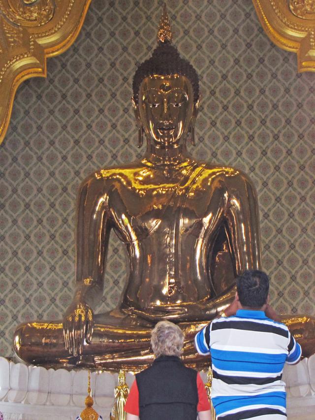 Потом они взяли тук-тук. Это повозка на 2 или 4 человек с водителем, и поехали по городу. Винай с удовольствием и воодушевлением рассказывал обо всем, что видел. В одном из Храмов (Ват Траймит) ее удивили ремонтные работы: голова Будды, не меньше 3 метров в диаметре, сделанная из металла, была разрезана пополам и просто лежала на земле. Сварщик что-то варил внутри. Так что, с Буддой иногда и так обращаются. А внутри храма, высоко-высоко, ступеней 100, не меньше, в красивом зале стоял четырех метровый Будда (говорят, из золота), перед которым все преклонялись. Винай сложил две ладони на груди, и внимательно смотрел на статую.