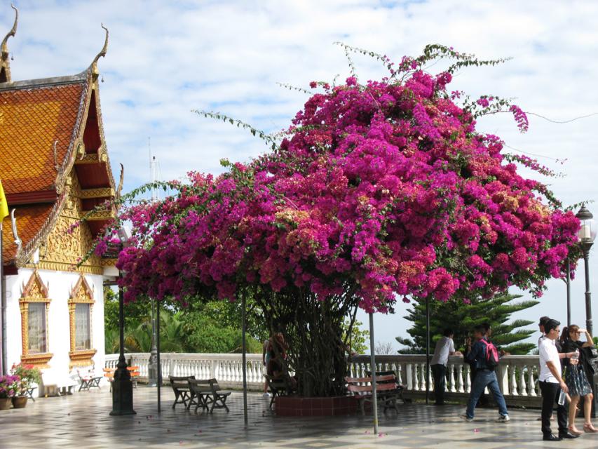 – Винай, слушай! Во-первых, на какой-то улице нашла маленький турофис, который тут же предложил мне доехать до дворца на красном автобусе. Но я вышла с целой группой французов у красивой лестницы, и стала подниматься. 300 ступеней вроде немного, но и немало. Только поднявшись, поняла, что нахожусь в Ват Дон Супет. По обрывкам фраз экскурсоводов еще поняла, что он самый почитаемый в Северном Таиланде. И что ему не то 500, не то 600 лет. Состояние идеальное. А розовая высоченная лестница с нагами – только восторг.