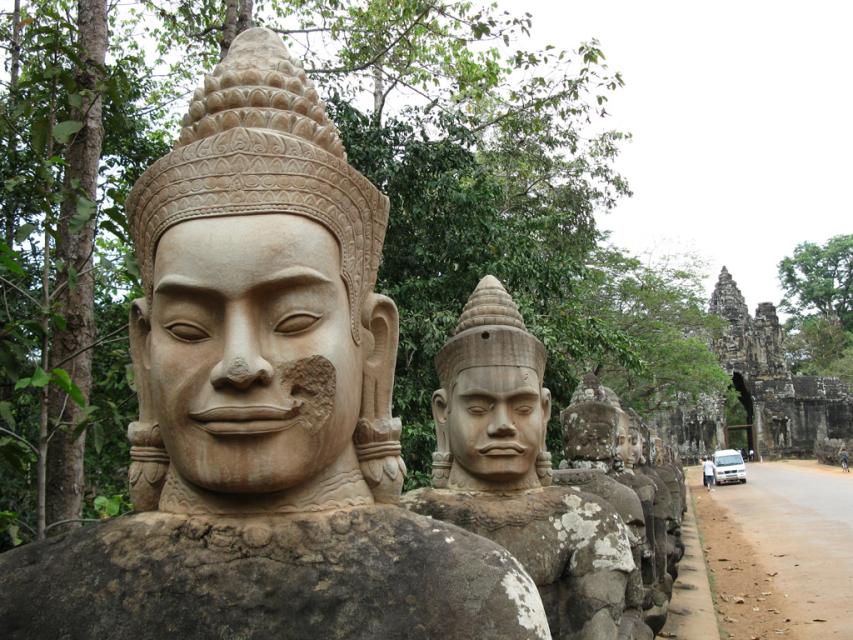 – Не буду, извини. Рассказываю дальше: к Ангкор Тому ведут 4 входа. Один из них – «Врата Победы». Дорога к этим вратам украшена огромными головами воинов. Они стоят с двух сторон дороги: ни одного теплого лица – все злые и жестокие.