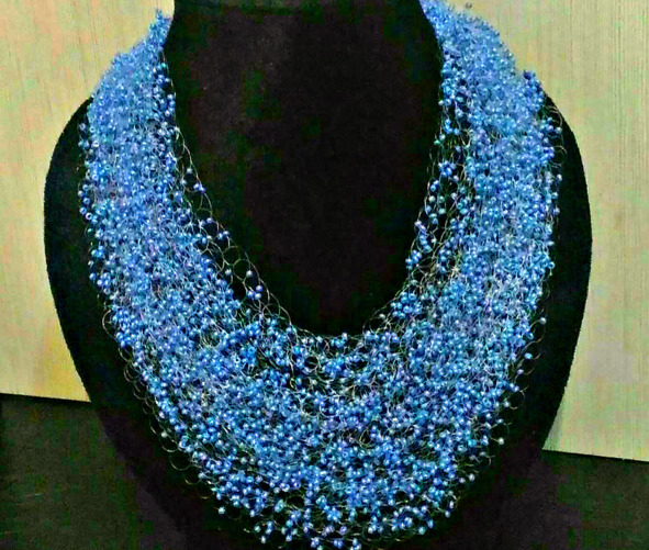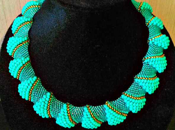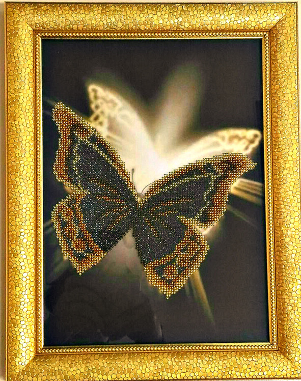 Не скрою, я получила огромное удовольствие от увиденного. Лариса работает не только с бисером, но и с лентами. От её украшений и картин невозможно оторвать взгляд, настолько они сделаны гармонично: сюжет, узор, цвет и оформление – всё взаимосвязано. Свою первую работу она помнит до сих пор. Это огромная бабочка, выполненная в золотисто-тёмных тонах, которая летит на свет и отражается в нём.
