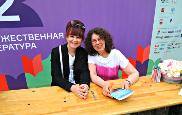 С Дарьей Донцовой, писательницей иронических детективов, на Книжном Фестивале в Москве на Красной площади. Матрёшку-мопса она вручила мне за рассказ, который занял I место в её группе ВК.