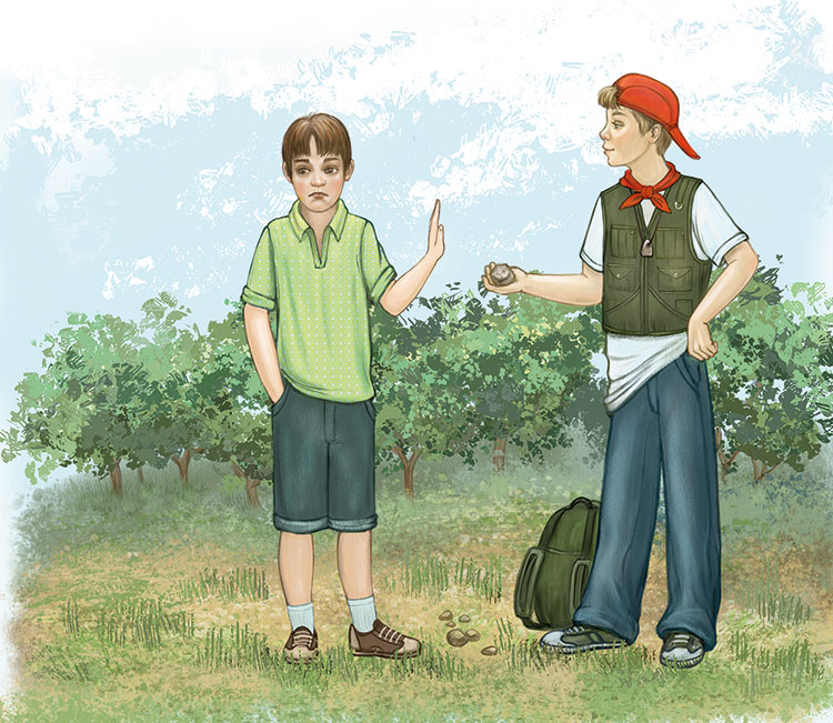 – Уф! Одно дело сделано. А теперь пора перекусить! – скомандовал Федя. – Садись под этот куст, в тенёчек! Только палкой траву повороши сначала: вдруг там змея.