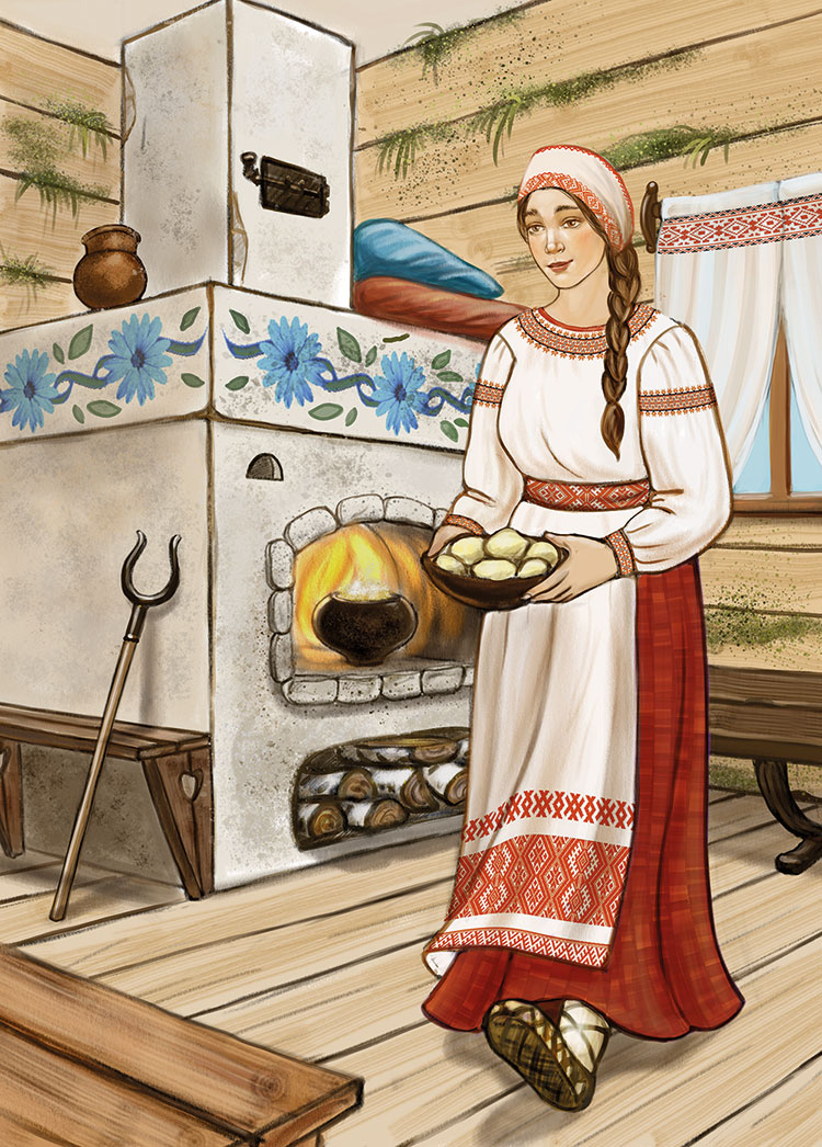 Утром мальчиков позвали снедать[6]. Юра крутил головой, во все глаза рассматривая избу, состоящую из одной комнаты. Из бревенчатых стен торчал мох. Светлые деревянные полы были не покрашены. На крюке к потолку подвешена люлька, в которой что-то лепетала маленькая Светана. Рядом стоял огромный сундук-скрыня с одеждой, накрытый тканым покрывалом. Увидел Юра и прялку, и лучину – точно такие, как в учебнике. Центром всего была, конечно, белёная печь, расписанная голубыми васильками, у которой суетилась Алёна в полосатой юбке и переднике. Юре стало вдруг очень тоскливо, и он часто заморгал глазами, еле сдерживая слёзы. Алёна сразу поняла, чтó с ним происходит, и крепко обняла мальчика.