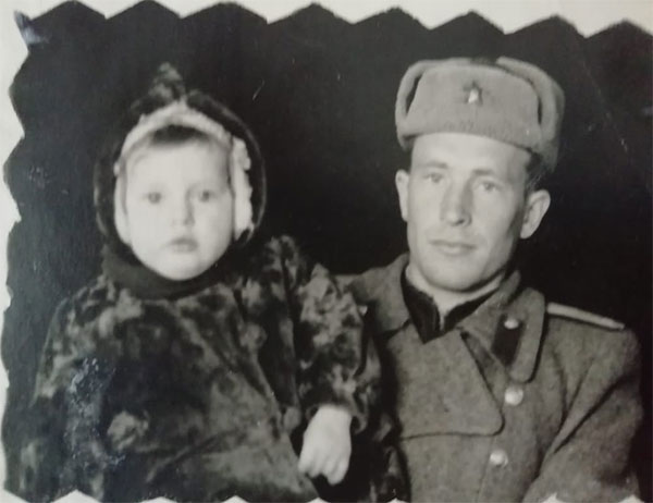 Никто нас не предупредил в части, что накануне был сильный ливень, и мост вообще сорвало. Идем по берегу, и передо мной что-то непонятное, а это Коля был, обвешенный вещами. Его из-под вещей даже не было видно. Подходим, а моста нет, торчит только невысокий столбик и всё. Что делать-то? Коля раздевается, река неглубокая, но очень быстрое течение и холодная вода, перенес вещи на противоположный берег. Наташеньку уложили наверх этого столба, благо, что он был сучковатый, и Коля и меня тоже нес на руках, спотыкаясь о камни. А я, все это время, смотрела на маленький белый сверточек. Вдруг подбежала собака, стала посматривать на столб – я обмерла. Коля дико заорал, и она убежала. Хорошо, что ночь была тихая, лунная, теплая. Было не так страшно. Коля вернулся, взял Наташу на руки и перенес её тоже на другой берег.