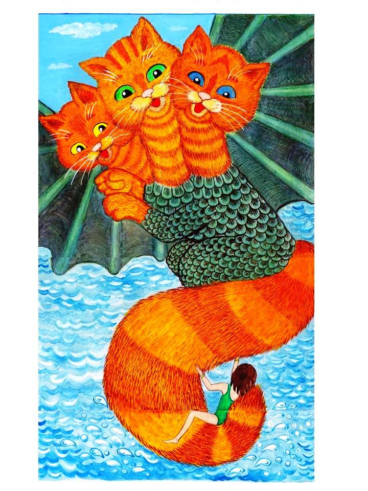 Когда они подбегали к бухте, то услышали шум, тут звучало мурлыкание тысячи котов, смех и визг малышей и какая-то возня. Обогнув скалу, они увидели следующую картину – на песке, у самой воды, вытянувшись и громко мурлыкая от удовольствия, лежал Дракокот. Всего его буквально облепили малыши, они теребили его уши, гладили головы, зарывались в мех и с весёлым смехом и визгом скатывались с хвоста, как с горки, прямо в воду. Рядом стояли мамы и помогали малышне взбираться на Дракокота.