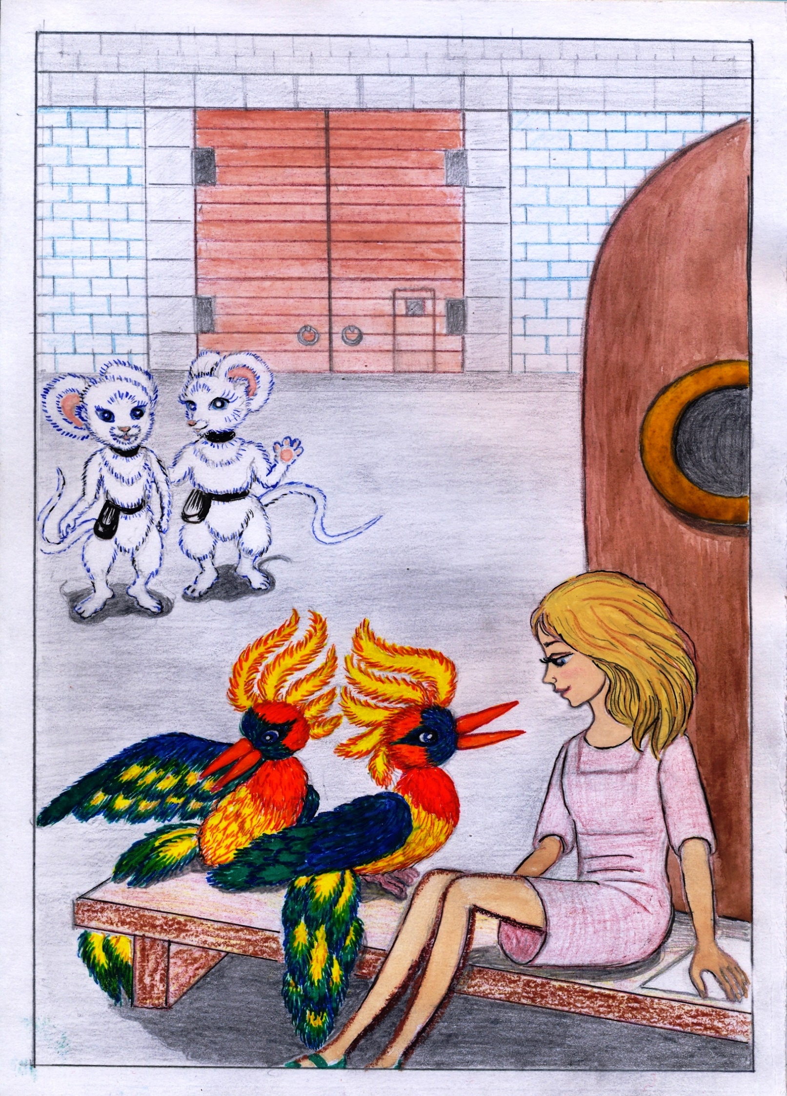Утро нового дня Алёнка встретила на новом месте. Звуки военных маршей звучали здесь гораздо тише, но всё равно, по привычке, она встала очень рано. Девочка так привыкла ко всему этому, что этот «ясельный» режим, который её бесил поначалу – рано ложиться и рано вставать, стал ей даже нравиться. У неё всегда было хорошее настроение и вовсе не хотелось спать по утрам. Сначала она занялась своими обычными утренними делами – по новой привычке немного помаршировала, позавтракала, приготовила коробки с едой, теперь ещё и для музыкантов. Выйдя из своего жилища, девочка села на скамью и стала выполнять задание Мастера по рисунку. Вдруг она заметила, что над ней промелькнула какая-то тень, Алёнка подняла голову и увидела знакомую птицу, с ярким оперением. Сделав над девочкой круг, та опустилась на скамейку рядом с ней.