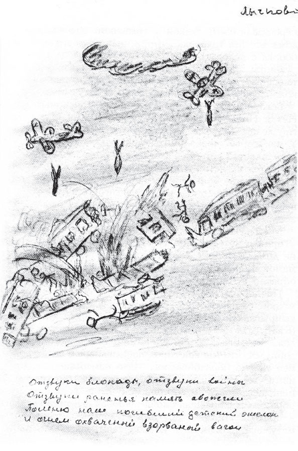 Что случилось после очередной бомбежки, я уже совсем не могу объяснить. Поезд остановился. Все вышли из вагона. Лежачих тоже вынесли из вагона на поляну под откосом. Зачем? Не знаю. Как долго стоял поезд, тоже не знаю. Почему поезд стал двигаться, если люди не успели сесть в вагон, я тоже не знаю. Бегущих детей стали подсаживать в вагон, и запрыгивали сами взрослые. Поезд набрал скорость и ушел, а лежачие раненые дети остались на поляне под откосом. Мы орали от ужаса до изнеможения. Ползком мы сбились в одну кучку, тесно прижимаясь друг к другу. Мы были раздеты, голодны, беспомощны, без взрослых. Мы даже не знали имен друг друга. Мы орали, засыпали и снова орали, когда просыпались. Сколько это продолжалось, не знаю. И вдруг кто-то стал разбирать нас из нашей дрожавшей и орущей кучи. Когда я пришла в себя, увидела, что меня несет на руках военный в очках. Других детей тоже несли военные. Может, это была одна из наших отступающих частей, наткнувшаяся на нас случайно. Они нас успокоили, накормили и обогрели. Они расспрашивали нас, откуда мы там оказались, в безлюдных местах. Я не знаю, что рассказывали дети. Я не знаю, как долго мы шли, и как далеко это случилось от Ленинграда, и как мы добрались до дома. Все воспринималось так, как складывалось. За такой короткий промежуток времени произошло так много ужасных событий и потрясений, что, будь я и в более старшем возрасте, и тогда не смогла бы все понять и объяснить. Я даже не знаю, кто позаботился обо мне и как я попала в Ленинград… и домой.