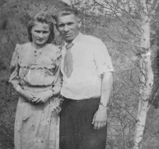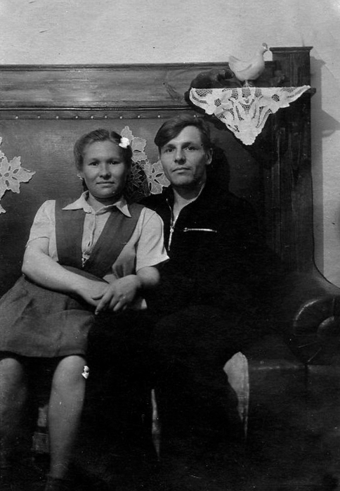 Знаю, что папа в школе хорошо учился. Я видела папин табель с отличными отметками об окончании семилетки. Был папа щёголем, хоть и деревенским. То шарф повяжет с особым форсом, то шапку сдвинет набекрень. Став взрослым, он всегда выглядел элегантно. В костюме, при галстуке, на брюках стрелки наглажены, ботинки начищены. Весной мужики в сапогах по грязи шлёпают, а папа в ботиночках с камушка на камушек перепрыгивает. Не простой деревенский парень, а франт столичный. Откуда это в нём? На фото мама с папой, 1952 г.