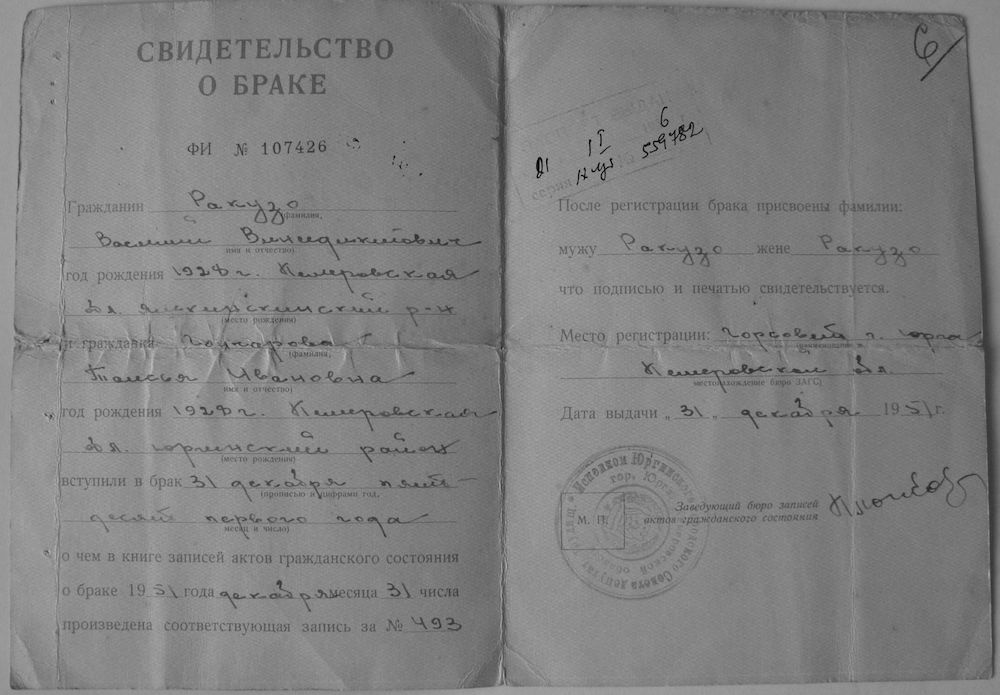 После армии папа женился на маме и 31 декабря 1951 года в Юргинском ЗАГСе был зарегистрирован брак между Ракузо Василием Винидиктовичем и Гончаровой Таисией Ивановной.