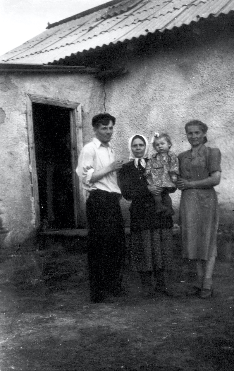 В Юрге папа пошёл работать на машзавод в цех № 50 подручным сталевара. Как главный герой из кинофильма «Весна на Заречной улице». В горячем цехе (как тогда говорили), хорошо зарабатывал. Соседи и знакомые приходили к нам перехватить денег взаймы до зарплаты. Получил жильё – домик на «43 пикете». Дом состоял из комнаты и кухни. Жили мы впятером – мама, папа, я и бабушка с тётей Ниной. Тётя Нина, старшая папина сестра, женщина одинокая и полуграмотная. В комнате на диване спала я, там же стояла родительская железная кровать с никелированным изголовьем. Посередине комнаты стоял круглый стол. Над столом висел большой, жёлтый абажур с бахромой. Бабушка с тётей Ниной спали в кухне за печкой. Места всем хватало. На фото папа, мама и я у бабушки на руках, наш дом на 43 пикете, 1954 г.