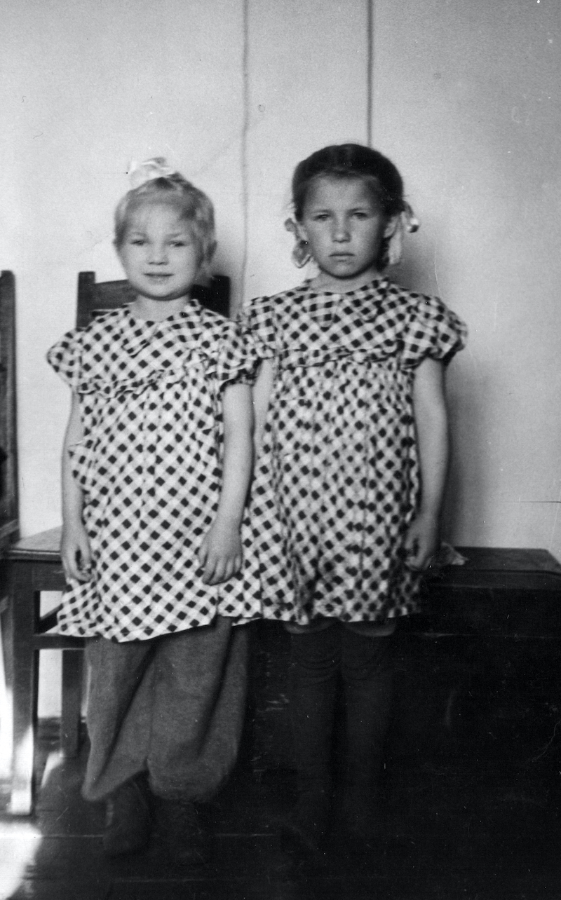 Наш родной дядя, Александр Иванович Гончаров, был нашим семейным фотографом. Мы очень признательны ему за все наши фотографии. Тогда фотоаппараты были большой редкостью. Благодаря ему, мы теперь с ностальгией разглядываем старые, чёрно-белые фотографии. Нам есть на что посмотреть и что вспомнить! Жена дяди Саши – Валентина Владимировна Корникова, хоть и была родом из села Поломошное, но была дамой с изящными манерами, к тому же эрудированная и приятная собеседница. У дяди Саши и тёти Вали было двое детей – Володя и Оля, наши двоюродные брат и сестра. На фото – двоюродная сестра Оля Гончарова и я (справа).