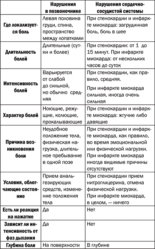Опытный врач уже после опрашивания больного может определить происхождение болевого синдрома и неприятных ощущений в груди: связаны ли они с болезнями сердечно-сосудистой системы или с нарушениями в позвоночнике. Кроме того, не следует забывать о том, что инфаркт также проявляется болями в груди. В схеме, которую я привожу в виде таблицы (табл. 1), вы можете увидеть сравнительные различия болевого синдрома в груди при нарушениях в позвоночнике и болезнях сердечнососудистой системы.