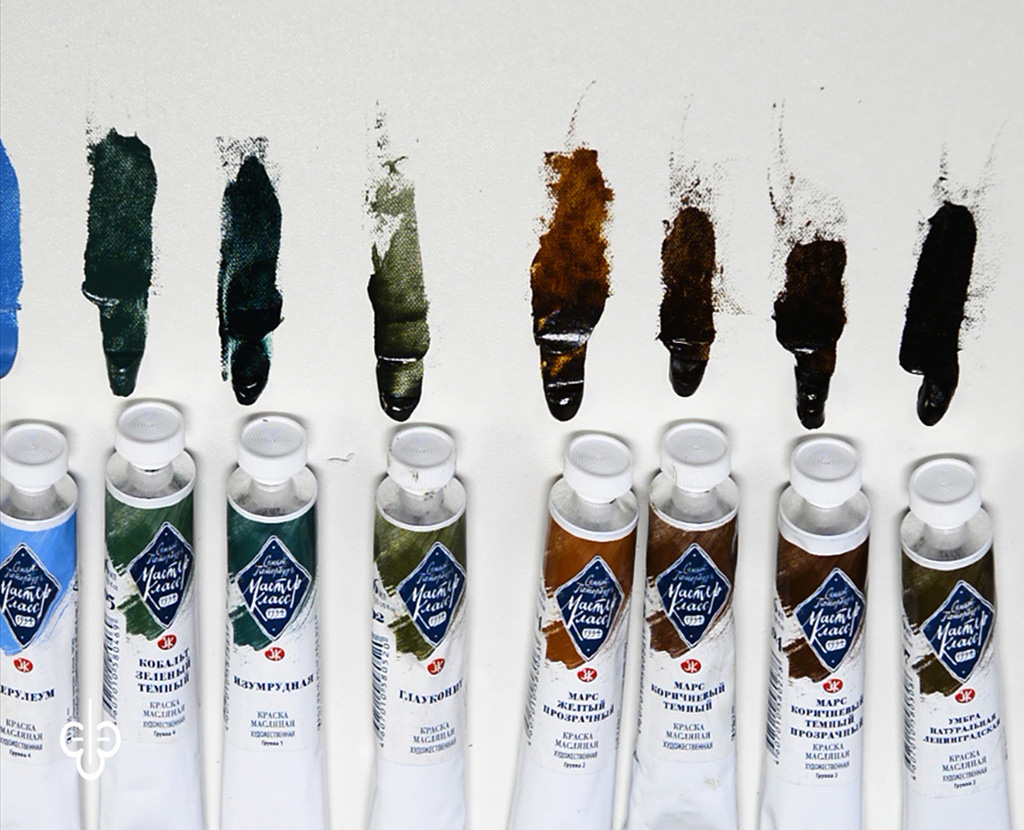 Итак, порядок таков: белила, кадмий желтый средний, охра желтая, кадмий красный светлый, краплак темный, ультрамарин темный, кобальт синий средний церулеум, кобальт зеленый темный, изумрудная, глауконит, марс желтый прозрачный, марс оранжевый прозрачный, марс коричневый темный прозрачный, умбра Ленинградская натуральная, марс черный. Это основной набор красок (ил. 2). Полный же набор зависит от характеристик конкретной постановки.