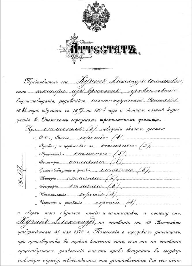 Вот в этом городе в Городском трёхклассном училище и продолжил своё образование Александр Кучин. Он учился здесь с 1899 по 1903 год. Сохранился аттестат об окончании училища. Оценки «отлично» по русскому и церковно-славянскому языкам, арифметике, геометрии, естествоведению и физике, истории, географии. «Хорошо» по Закону Божию, чистописанию, черчению и рисованию.[13] По Положению о городских училищах 1872 года он имел право без экзамена получить первый классный чин на государственной службе и пользоваться льготами при прохождении воинской службы.
