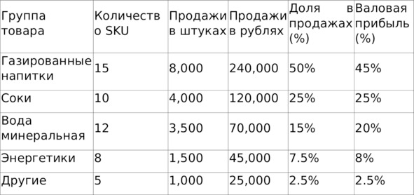 В магазине представлен ассортимент безалкогольных напитков, разделенный на несколько групп (например, «Газированные напитки», «Соки», «Вода минеральная», «Энергетики» и т.д.). За последний месяц у вас есть данные по каждой группе.