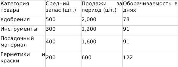 В отделе «Сад и огород» представлены различные категории товаров (например, «Удобрения», «Инструменты», «Посадочный материал», «Герметики и краски» и т.д.). За последний год у вас есть данные о среднем запасе (в штуках или стоимости) и объеме продаж по каждой категории.