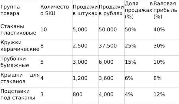 – Долю каждой группы в общем объеме продаж (в процентах)