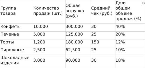 В категории «Кондитерские изделия» представлены различные группы товаров, такие как конфеты, печенье, торты, пирожные и шоколадные изделия. За последний месяц у вас есть данные о продажах по каждой группе.