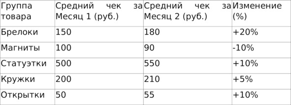 В категории «Сувениры» представлены различные группы товаров, такие как брелоки, магниты, статуэтки, кружки и открытки. За последние два месяца у вас есть данные о продажах по каждой группе и среднем чеке.