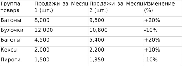 В категории «Хлебобулочные изделия» представлены различные группы товаров, такие как батоны, булочки, багеты, кексы и пироги. За последние два месяца у вас есть данные о продажах по каждой группе.