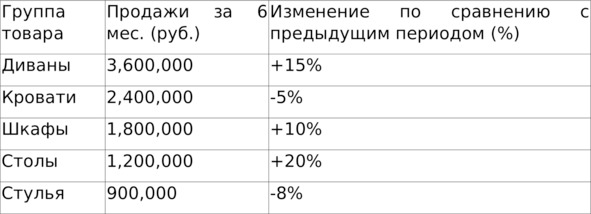 В категории «Мебель» представлены различные группы товаров, такие как диваны, кровати, шкафы, столы и стулья. За последние 6 месяцев у вас есть данные о суммарных продажах каждой группы.
