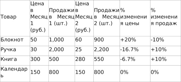 За последний квартал у вас есть данные о продажах и ценах на определенные товары. В ходе анализа необходимо понять, как изменение цен повлияло на объем продаж и общую выручку.