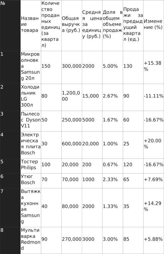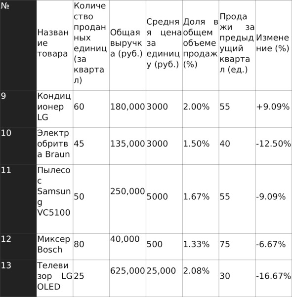 – Сравните показатели с предыдущим кварталом (если есть данные) и отметьте товары с ростом или снижением продаж.