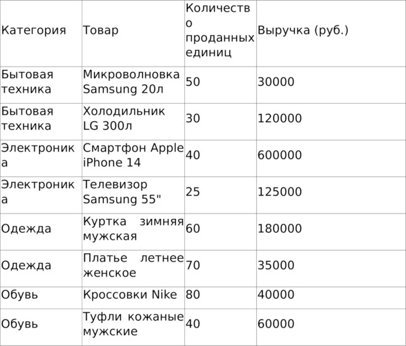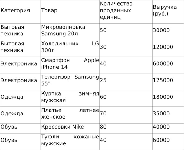 В магазине продаются товары, разделённые на несколько категорий: «Бытовая техника», «Электроника», «Одежда», «Обувь». За последний квартал у вас есть данные о продажах каждого товара в этих категориях.