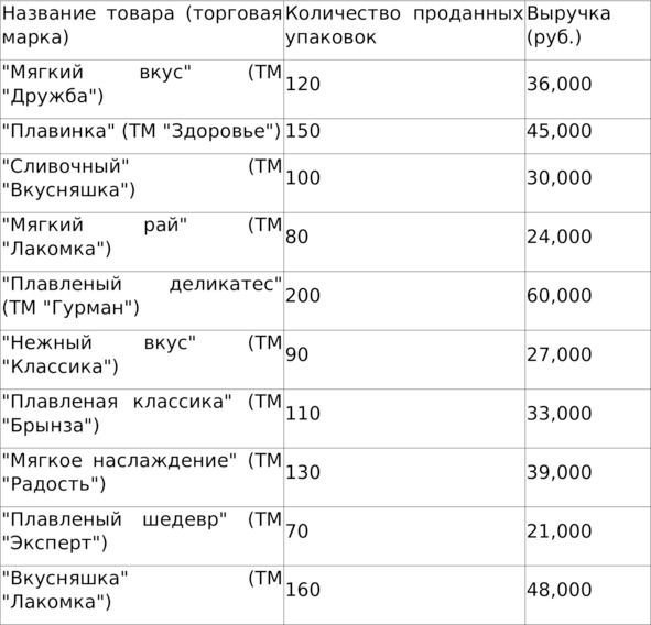 В магазине есть ассортимент сыров плавленных различных торговых марок. За последний месяц у вас есть данные о продажах каждой марки: количество проданных упаковок и выручка.