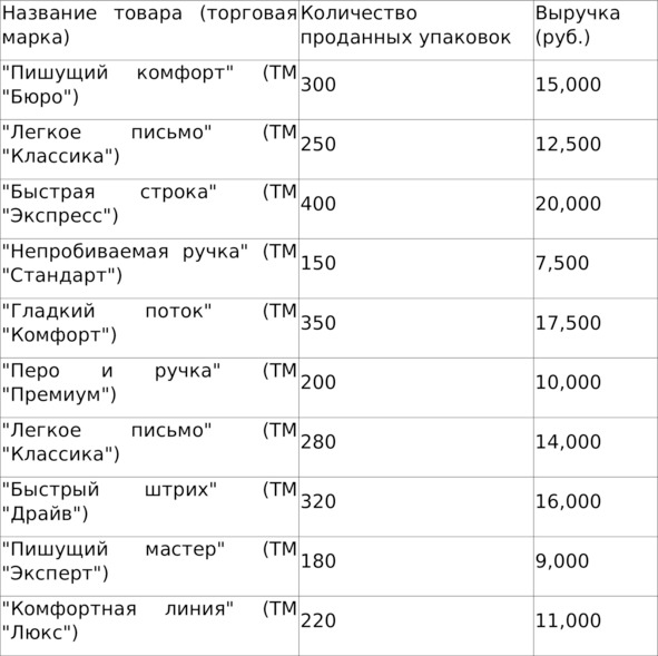 В магазине представлен ассортимент ручек канцелярских различных торговых марок. За последний месяц у вас есть данные о продажах каждой марки: количество проданных упаковок и выручка.
