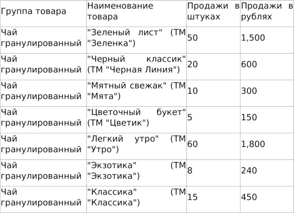 В магазине есть ассортимент чая, гранулированного различных торговых марок. Вам предоставлена таблица с данными о продажах за последний месяц. Необходимо определить товары, которые характеризуются низкой оборачиваемостью – то есть, продаются медленно и требуют внимания для возможного списания или маркетинговых мероприятий.