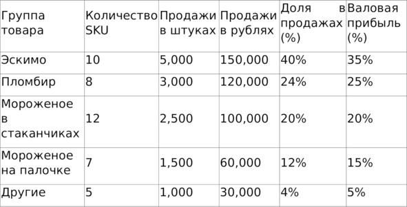 В магазине есть ассортимент мороженого, разделенный на несколько групп товаров (например, «Эскимо», «Пломбир», «Мороженое в стаканчиках» и т.д.). За последний месяц у вас есть данные по каждой группе.