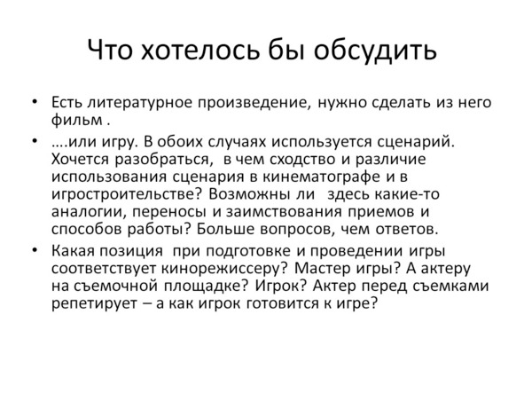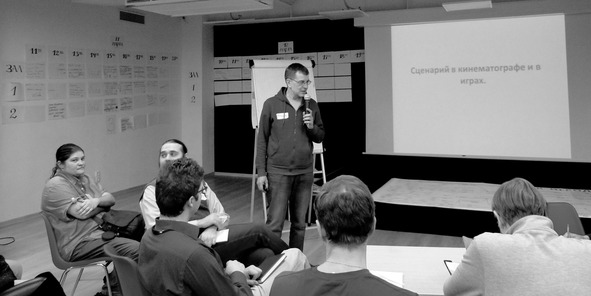 Вот именно это я и собираюсь обсуждать, что синхронизировать ничего не получается, потому что сколько игроков, столько и сценариев. Можно их в группы объединить, можно разными способами эту проблему решать, но собственно проблема понятна – сколько игроков, столько историй. Так, если в кино есть протагонист, антагонист, главный герой, второстепенный… А здесь героев столько, сколько игроков, предполагаемые обстоятельства они создают себе сами, и стратегии они себе выбирают сами, то есть, у каждого своя история, свой сценарий. Собственно, эту проблему я и буду обсуждать, пытаться какие-то вещи перенести из кинематографа.