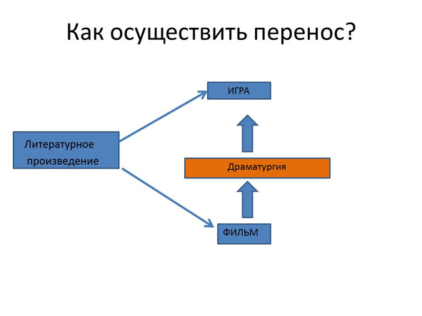 Теперь – в драме. Я двигаюсь через драматургию, поскольку мне кажется, что если мы хотим что-то понять про игру и понять про сценарий в кино и в драме, то нужно найти некоторый медиатор, в кино и в игре нужно найти медиатор. Медиатором для меня является драма и драматургия. И элементы драматургии, на мой взгляд, позволяют переносить некоторые вещи, которые делаются в кино, и некоторые вещи, которые делаются в игре, и сопоставлять их, поскольку драматургия обладает такой интересной особенностью – она как бы не привязана ни к кино, ни к игре, ни даже к театру, а существует сама по себе. В этом, собственно, мысль моя состоит, я буду рад вперёд двигаться, пытаясь её как-то развивать. В этом метод движения.