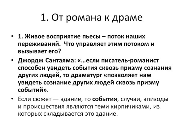 Первый тезис: живое восприятие пьесы – это поток наших переживаний. Что управляет этим потоком? Если писатель-романист способен увидеть события сквозь призму сознания других людей, то драматург позволяет нам увидеть сознание других людей сквозь призму событий. А дальше начинается следующая вещь, очень важное различение двух понятий, которые вообще-то в драматургии изначально различаются: это фабула и сюжет. Наверное, вы знаете… Значит, что такое сюжет? И что такое фабула? Фабулой обычно называется просто последовательность событий, идущих в хронологическом порядке одно за другим.