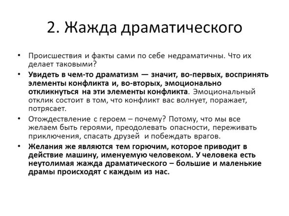 Дело в том, что происшествия и факты, с точки зрения Эрика Бентли, не драматичны. А что их делает таковыми, с его точки зрения? Драматизм – это вещь очень ценная. Если есть драматизм – значит, за этим можно смотреть, в этом интересно участвовать, это интересно производить и вообще, ты получаешь переживания и кайф.