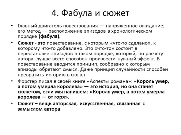 ВГ: Он пошёл, она сказала, а он ей ответил. А сюжет – это совершенно другая штука. Сюжет – это искусственно придуманная конструкция, вносимая драматургом в произведение для того, чтобы передать зрителю тот смысл, который он хочет передать. Это длинное определение, а вот самый простой пример этому – я не помню, кто сказал, здесь будет этот текст, я забыл фамилию человека… Вот фабула, да? Сначала умер король, потом умерла королева. Два последовательных события, что тут сложного? Добавляем одно слово: сначала умер король, потом умерла королева от горя. Есть, что играть, да? Понятен смысл, что у них была любовь, вот это всё возникло сразу, да? А всего-то навсего добавили одну фразу. И появился сюжет. И смысл появился. Сюжет – это то, что приносит смысл. В отличие от фабулы, которая, в общем-то, нормальная последовательность событий.