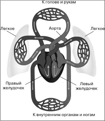 Правый желудочек отправляет кровь в систему сосудов, расположенных в легких, где она обогащается кислородом, отдает углекислый газ и возвращается обратно к сердцу. Этот участок кровеносного русла называется малым кругом кровообращения. Левый желудочек выбрасывает кровь в сосуды, пронизывающие все остальные органы и ткани и относящиеся к большому кругу кровообращения. Там кровь отдает кислород, забирает углекислый газ и другие отработанные продукты обмена веществ.