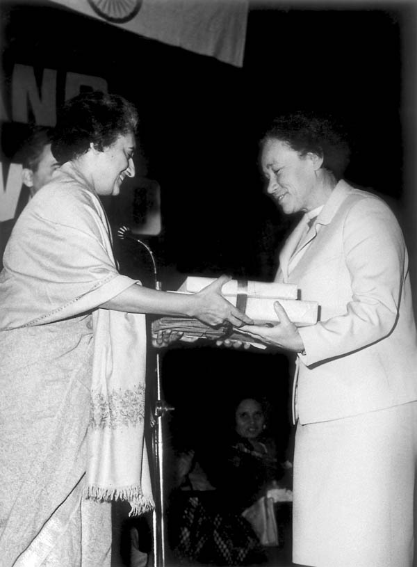 Премьер-министр Индии Индира Ганди вручает Международную премию имени Джавахарлала Неру сотруднику кафедры истории Индии Института стран Азии и Африки при МГУ Людмиле Васильевне Шапошниковой