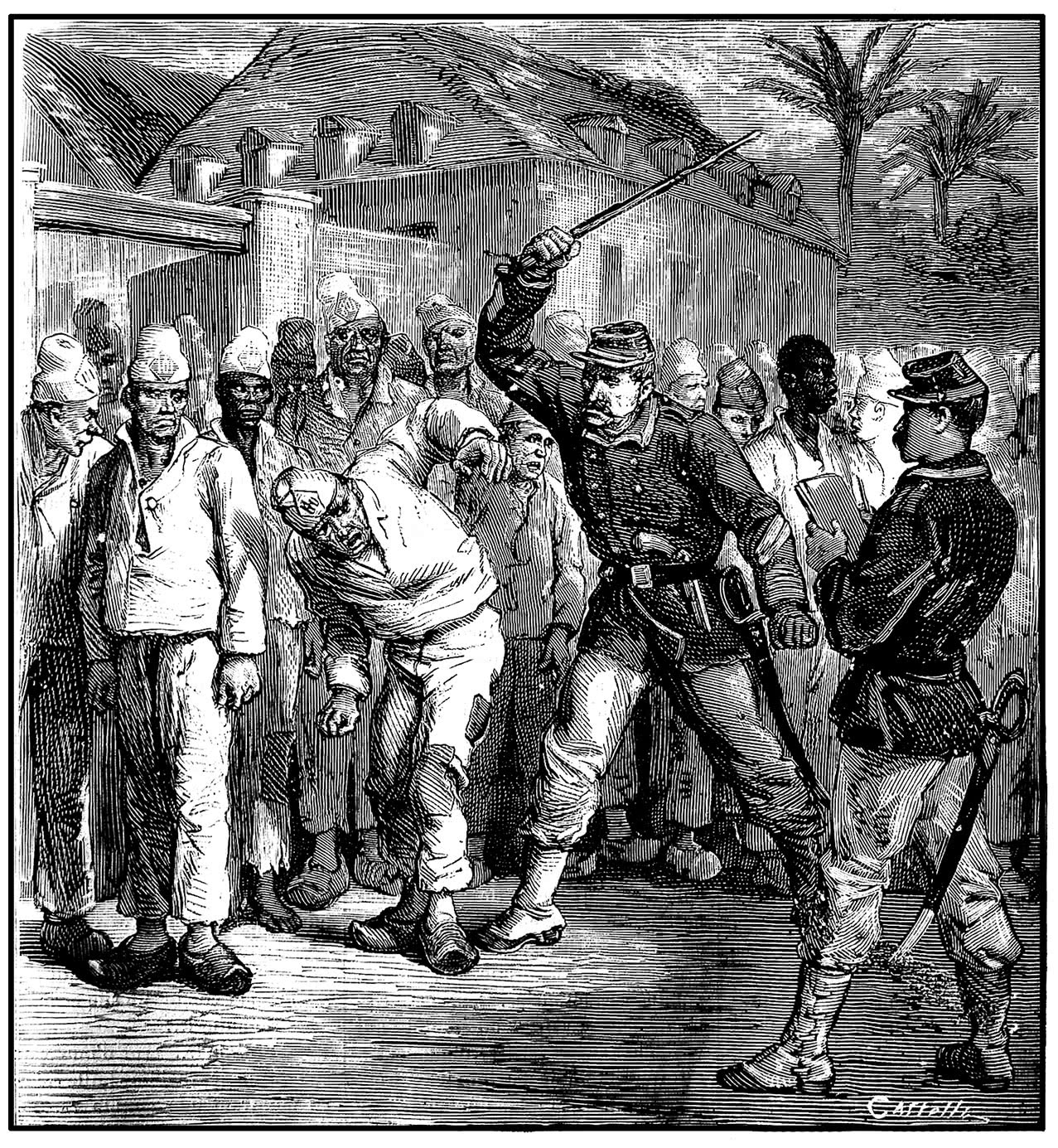 Мы использовали термин «сосланный», а не «высланный»; первым обозначают людей, осужденных по политическим делам, второй предназначен для тех, кто совершил уголовные преступления. Вот, собственно, единственная и чисто номинальная разница между этими людьми, установленная теми, кто отправил их в этот ад, и принятая среди тех, кто их охраняет. Все остальное было совершенно одинаковым: каторжный труд, пища, одежда и условия содержания. И сосланные, и высланные, смешавшиеся в жуткой тесноте, всего получали поровну, вплоть до щедрых ударов дубинки надзирателя Бенуа, имя которого, как мы уже убедились, ни в коей мере не соответствовало его нраву.