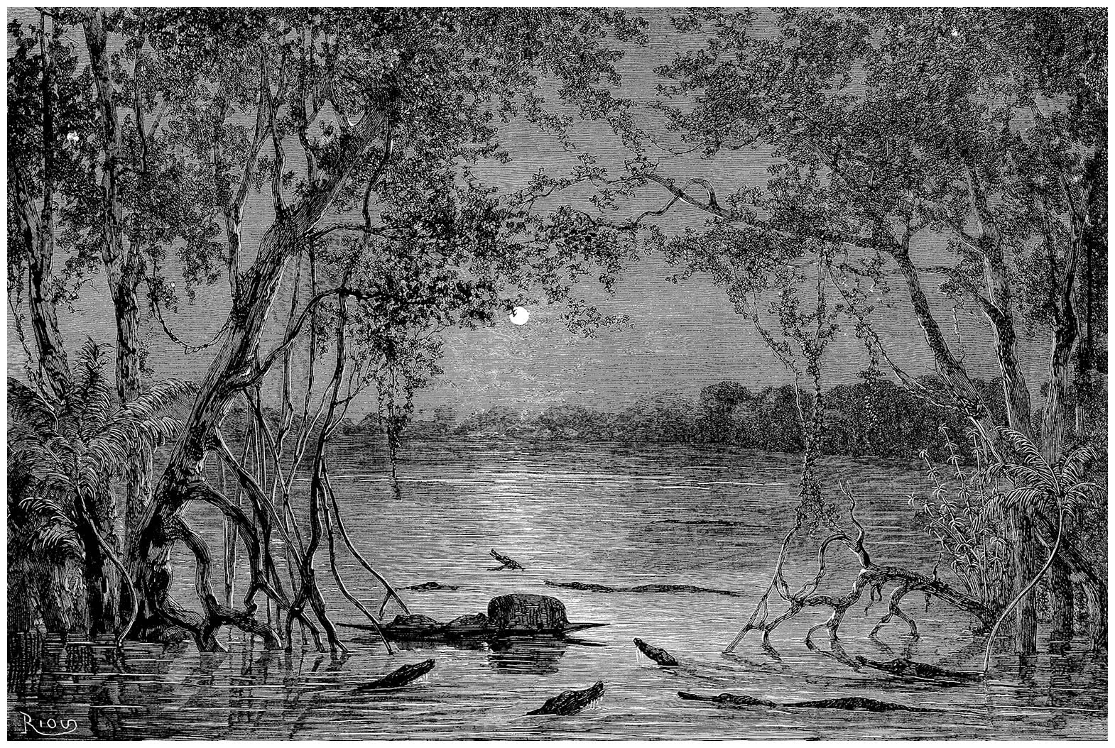 Старший надзиратель не ошибся в своих предсказаниях относительно грозы. Буйство экваториальной природы чудовищно, но кратковременно. Не прошло и получаса, как тучи рассеялись. Луна медленно выплыла из-за темной завесы прибрежных кустарников, засияв неизвестным в европейских широтах блеском, отразившимся в еще неспокойных водах реки и каплях дождя на листьях деревьев. То здесь, то там нежнейшие голубоватые лучи лунного света проникали сквозь густой свод листвы, скользя меж гигантских стволов, вздымающихся из непролазной мешанины цветов и листьев подобно бесконечной колоннаде собора.
