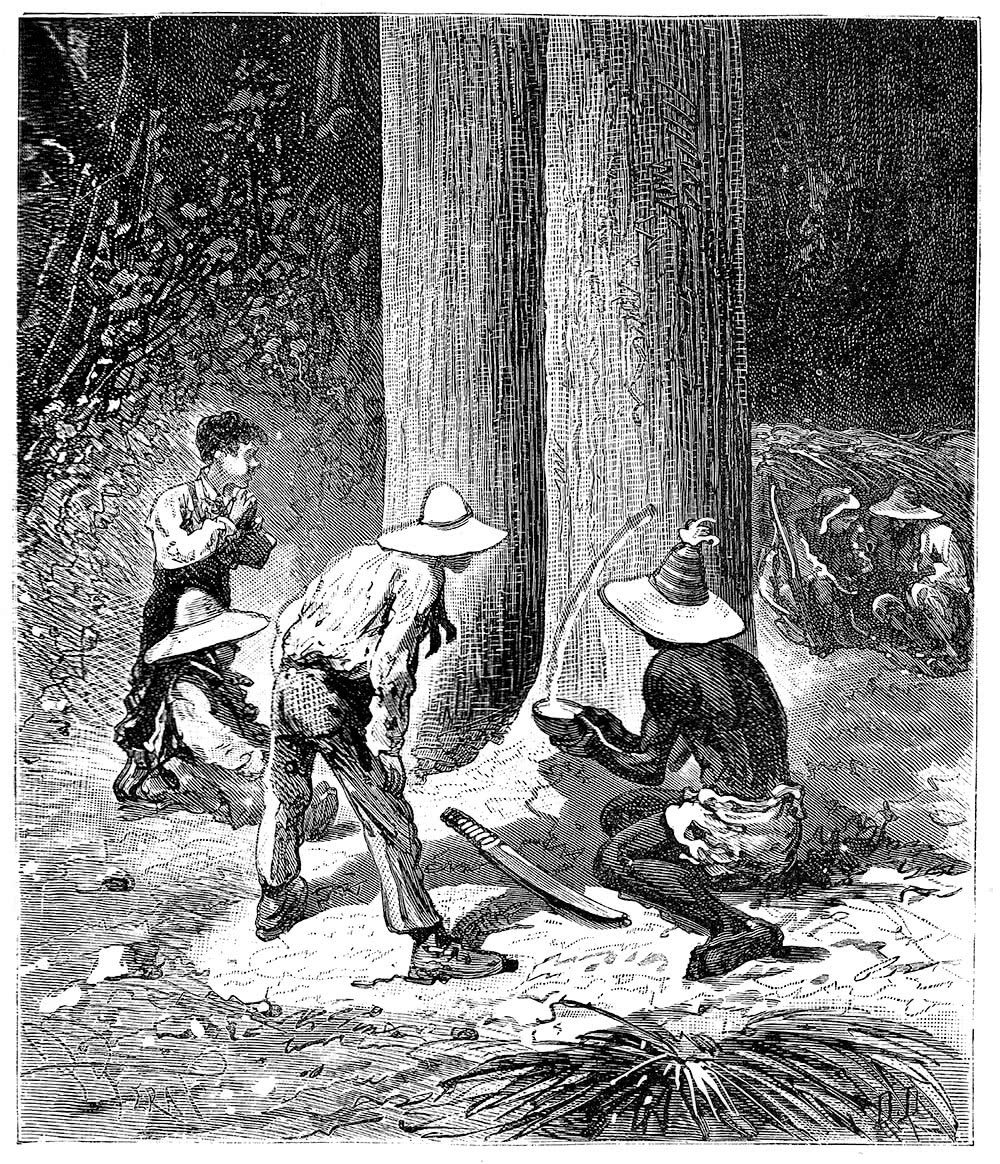 Робен изнывал от нетерпения, несмотря на быстроту, с которой действовал его чернокожий друг. Последний достал из пироги две плетеных чашки-куи, полностью водонепроницаемых благодаря внутреннему слою растительной смолы, известной как мани, которую добывают из дерева горная маниль, или moronoboea coccinea. Затем, приметив два великолепных дерева высотой более тридцати метров, с гладкими красноватыми стволами, он сделал на них два глубоких косых надреза в нескольких сантиметрах от земли.