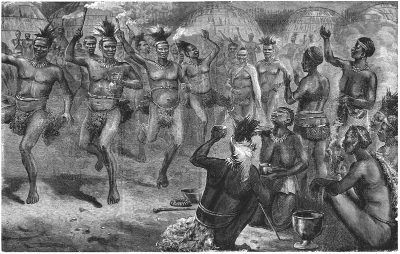 Танцоры под стать оркестру. Возбужденные его шумом, они сбрасывают накидки и становятся в круг. Все почти совершенно голые. У каждого в руке палка, или топорик, или копье. Каждый орет во всю силу своих легких. Затем все одновременно поднимают одну ногу и одновременно отбивают один удар. Это единственное движение, какое они производят все вместе. А дальше – кто во что горазд. Какие угодно телодвижения, какие угодно звуки! Вообразите оркестр, в котором каждый музыкант самым усердным образом исполняет свою собственную мелодию, или балет, в котором каждый танцует что вздумается, или хор, в котором каждый поет что бог на душу положит, – и вы едва ли получите представление об этом непостижимом смешении звуков и движений, которое воплощает радость жителей крааля. Руки и головы дергаются в разные стороны, все исступленно кричат; тучи пыли окутывают танцоров, так усердно колотящих ногами в землю, что после пляски в ней остается глубокий след.