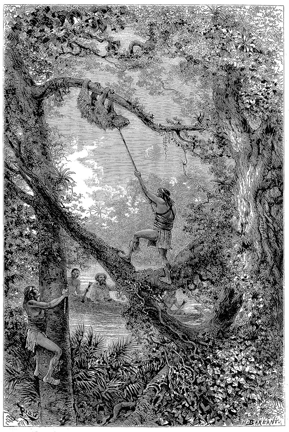 – Какая хватка, дети мои, какая хватка! И это еще не все, – продолжил Робен. – У ленивцев до такой степени развит инстинкт самосохранения, что он заменяет им разум. Если охотники застигнут его на середине поляны, то он даст изрешетить себя пулями, но не двинется с места, поэтому он не зря предпочитает селиться на деревьях, склоненных над водой. Когда он чувствует опасность, то резко ослабляет хватку, падает в воду и обычно спасается, пускаясь вплавь саженками.