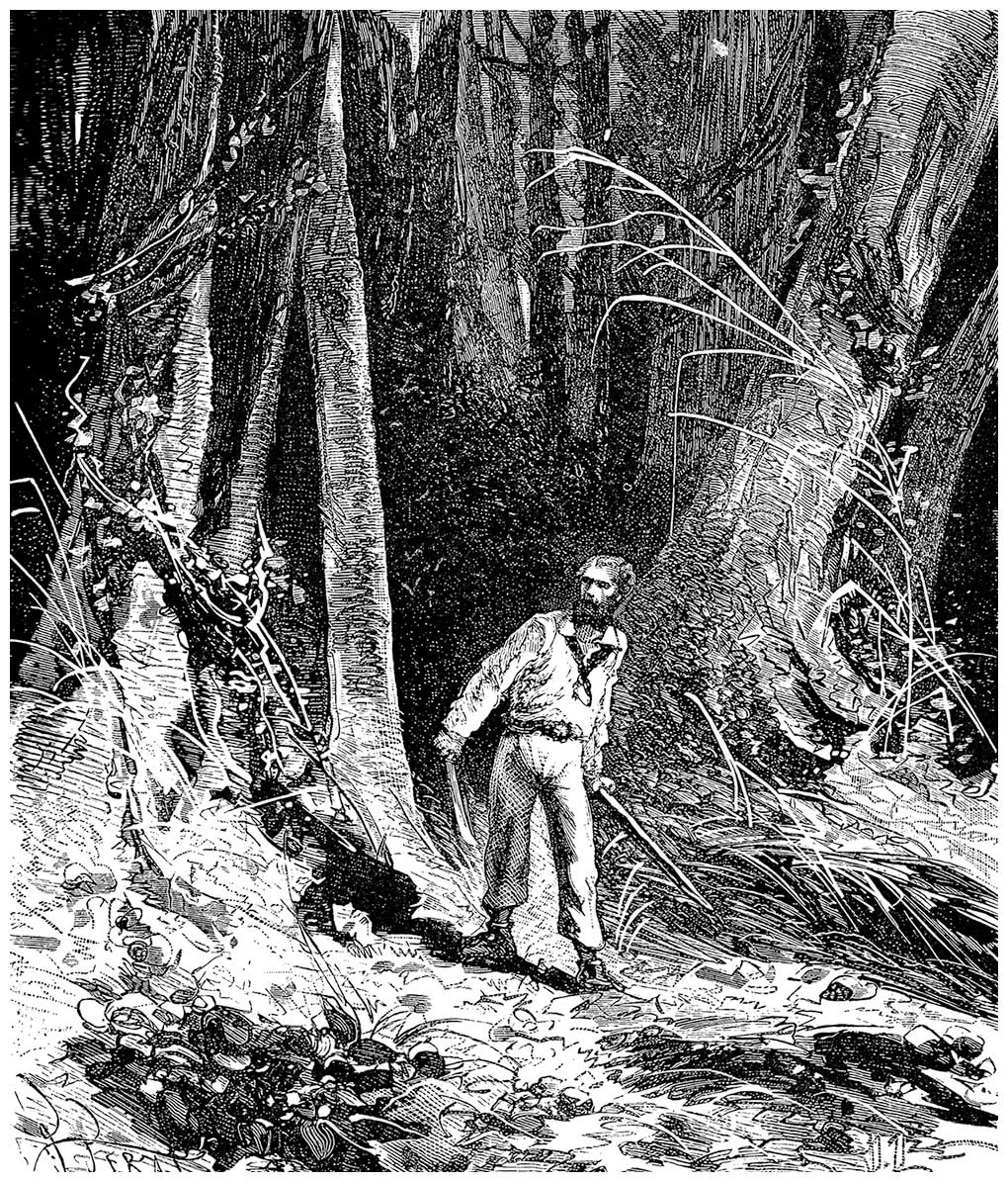 Автор этих строк побывал в лесах Нового Света. Он голодал и томился жаждой в той же пустыне с буйной растительностью, где сейчас сражается наш герой. Затерянный посреди невообразимой мешанины стволов, ветвей и лиан, потеряв из виду носильщиков с припасами, автор случайно наткнулся на то, что даже спустя несколько месяцев жизни в цивилизованном мире вызывает у него неописуемый ужас и необъяснимую дрожь.
