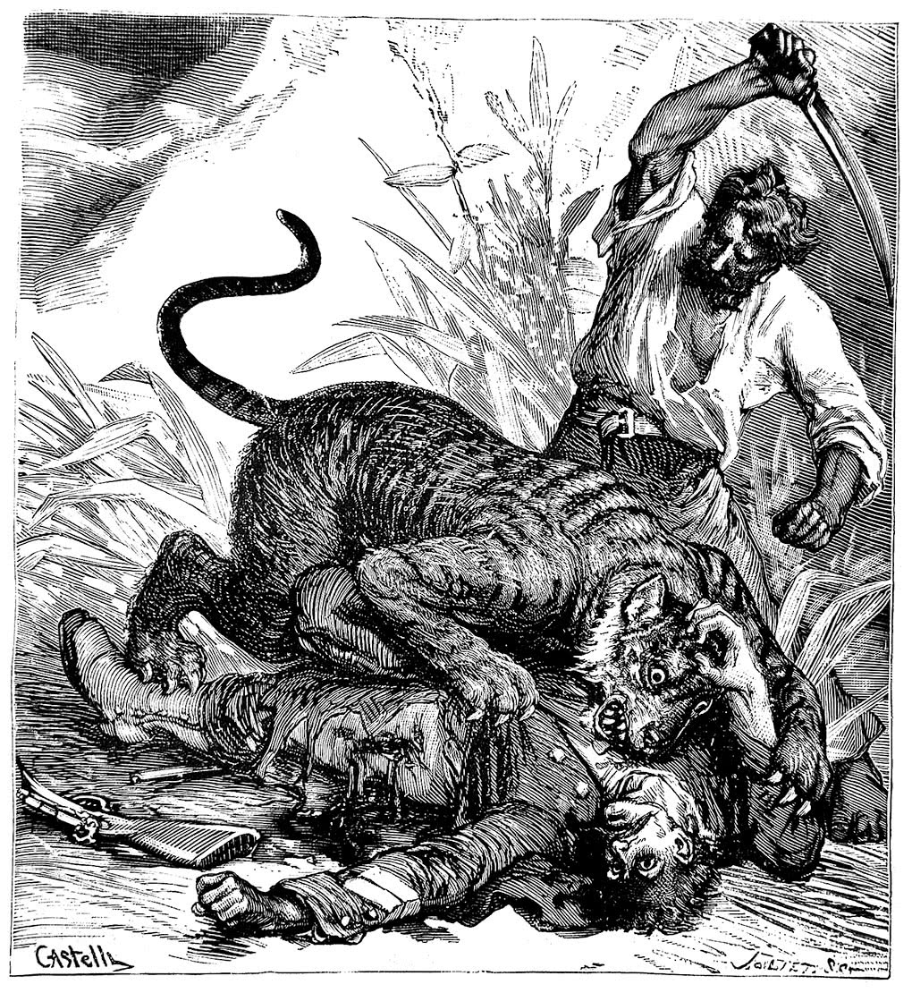 Но перед ним стоял грозный противник. Каторжник отбросил рогатину и занес мачете в правой руке. Клинок, направленный железной рукой, обрушился на шею зверя, мощную и мускулистую, как у бычка.