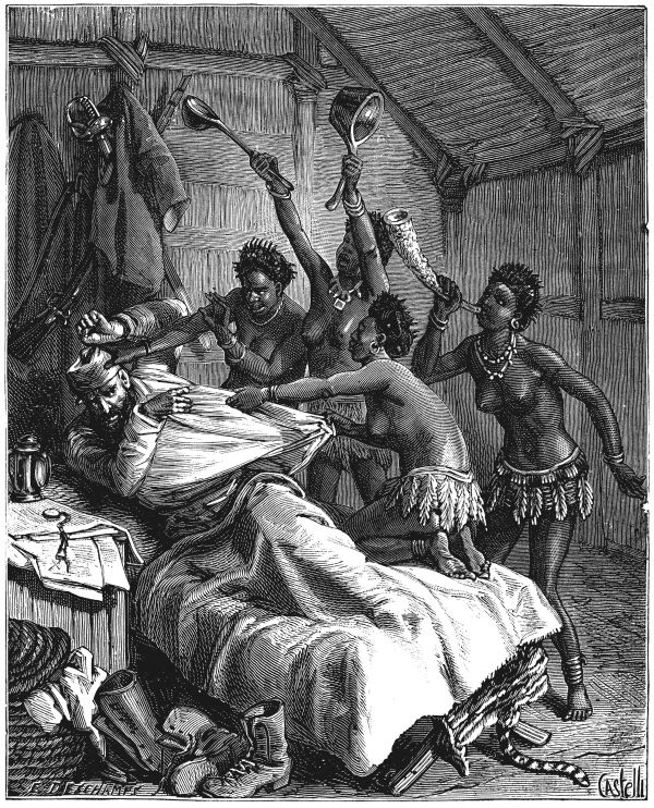Один из этих несчастных знал несколько слов по-английски. Дополняя их жестами, он объяснил, что все они являются последними из оставшихся в живых жителей некогда цветущей деревни. Между ними и их соседями возникла ссора, обе стороны взялись за оружие. Была отчаянная борьба, они оказались разбиты, неприятель унес весь их урожай и сжег деревню. В довершение несчастья стоит засушливая погода. Никаких источников существования. Они скитаются по лесам в поисках корней, ягод, диких фруктов, черепах или насекомых. Из-под просохшего слоя земли они выковыривают лягушек, которые там прячутся до наступления дождей. Жалкое пропитание! Многие погибли от голода. Их стрелы и копья не годятся для охоты за крупным зверем, который водится неподалеку. К тому же враги расположились на берегу речки, как раз в том месте, куда приходят на водопой слоны и носороги и где плещутся бегемоты. Несчастные не могут найти даже птичьи гнезда. Обычно они доставали неоперившихся птенцов и зажаривали их живыми, потому что окрепшие птенцы улетают далеко и за ними невозможно охотиться, не имея ничего, кроме «ноббери» – суковатой палки, которую они бросают, правда, с большой ловкостью.