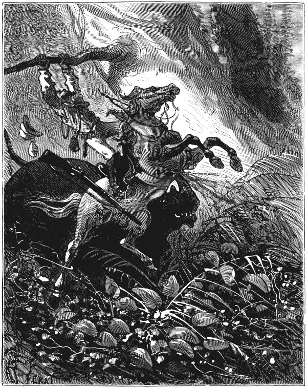 У Альбера и Жозефа лошади испугались, встали на дыбы и понесли в чащу. Конь Александра с испугу уперся всеми четырьмя ногами в землю. Он стоял как вкопанный, храпел и не желал или не мог повиноваться своему всаднику, хотя тот до крови вонзил ему шпоры в бока.