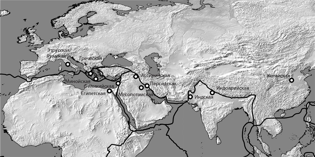 Крупнейшие ранние цивилизации и их близость к границам плит